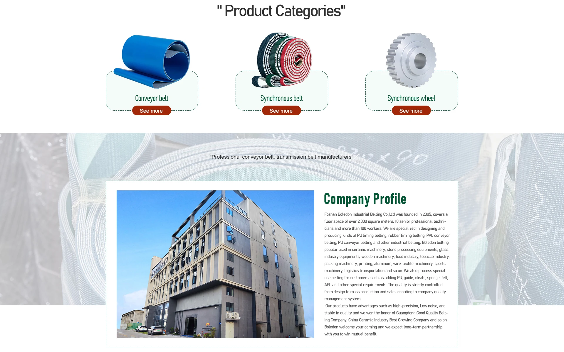 주요 제품:산업용 컨베이어 벨트, 타이밍 벨트, 전송 벨트, 폴리 우레탄 동기 벨트, 산업용 기계 벨트
